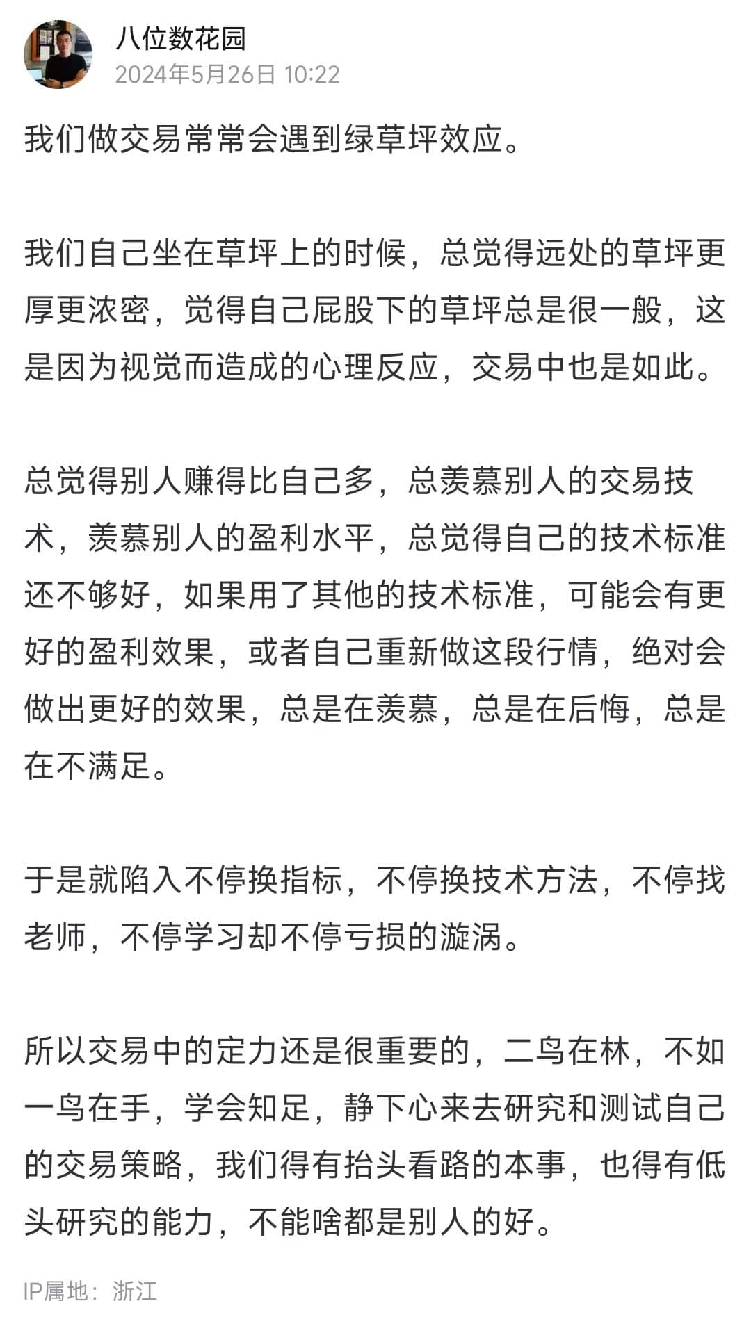 我们自己坐在草坪上的时候,总觉得远处的草坪更厚更浓密,觉得自己屁股下的草坪总是很一般,这是因为视觉而造成的心理反应,交易中也是如此。