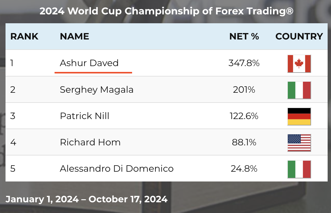 注:Ashur Daved 是今年2024年罗宾斯杯世界交易大赛中,外汇交易中目前排名第一的交易选手,创造了347.8%的收益率: